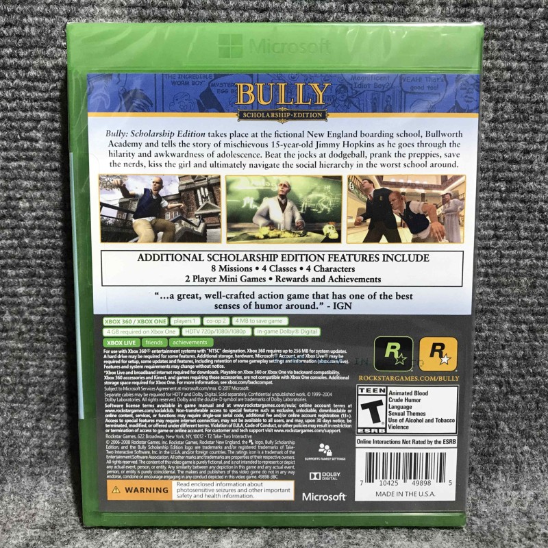Juego Bully Scholarship edition para la plataforma Microsoft Xbox One, nuevo y precintado, región NTSC USA, multidioma, incluye Español.